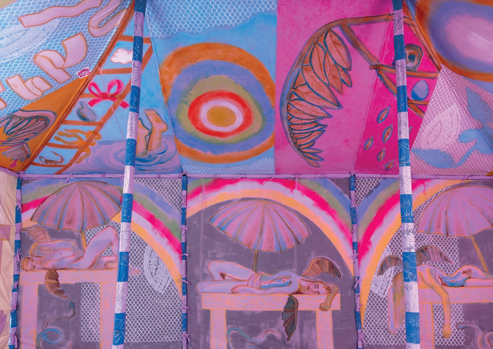 The first major exhibition in Australia of work by acclaimed Italian contemporary artist Francesco Clemente, and second in the annual Schwartz Carriageworks series of major international visual arts projects, Encampment includes six of Clemente’s celebrated large-scale tents, transforming 30,000 square feet of the precinct into an opulent tented village. Created in collaboration with a community of artists in Rajasthan, India, with exteriors that combine camouflaged fabric and golden embroidery, the tents in Encampment invite us into jewel-toned spaces populated by Byzantine angels. Presented by Carriageworks and Anna Schwartz Gallery.