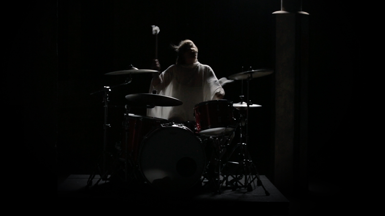 Improvised and urgent, her drumming score reverberates off the architecture, creating a sonic sense of place. Presented as a non-linear performance video, it asserts the extremities of the present as she tunes into the frequencies of time. Reflecting on the power and precarity of human existence, her drumming is a ritual action that ebbs and flows as much as a river, as much as life itself.