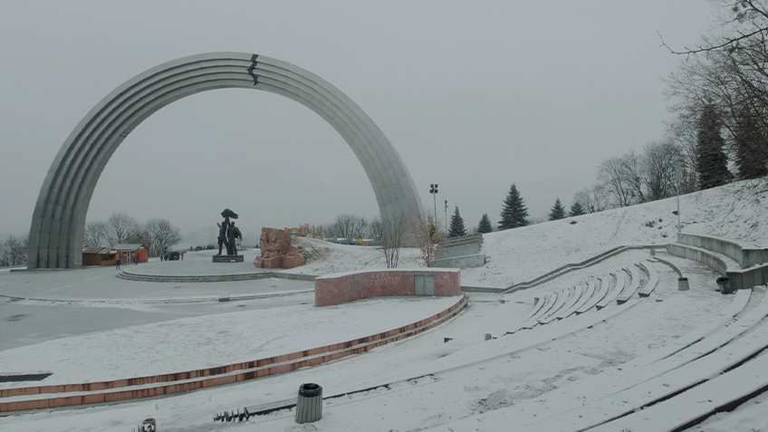 Perhaps the most memorable vignette is the sequence of Lenin statues. We are told they once numbered in the thousands (even though Lenin didn’t believe in heroic monuments) but now there are only several hundred. From panning shots, through a forest, to public squares emptied of people and white with snow, Lenin appears standing, striding, hailing, hand in pocket, hand on lapel, in bust form only. A litany of adjectives in shni-shni flows in lyrical accompaniment:
